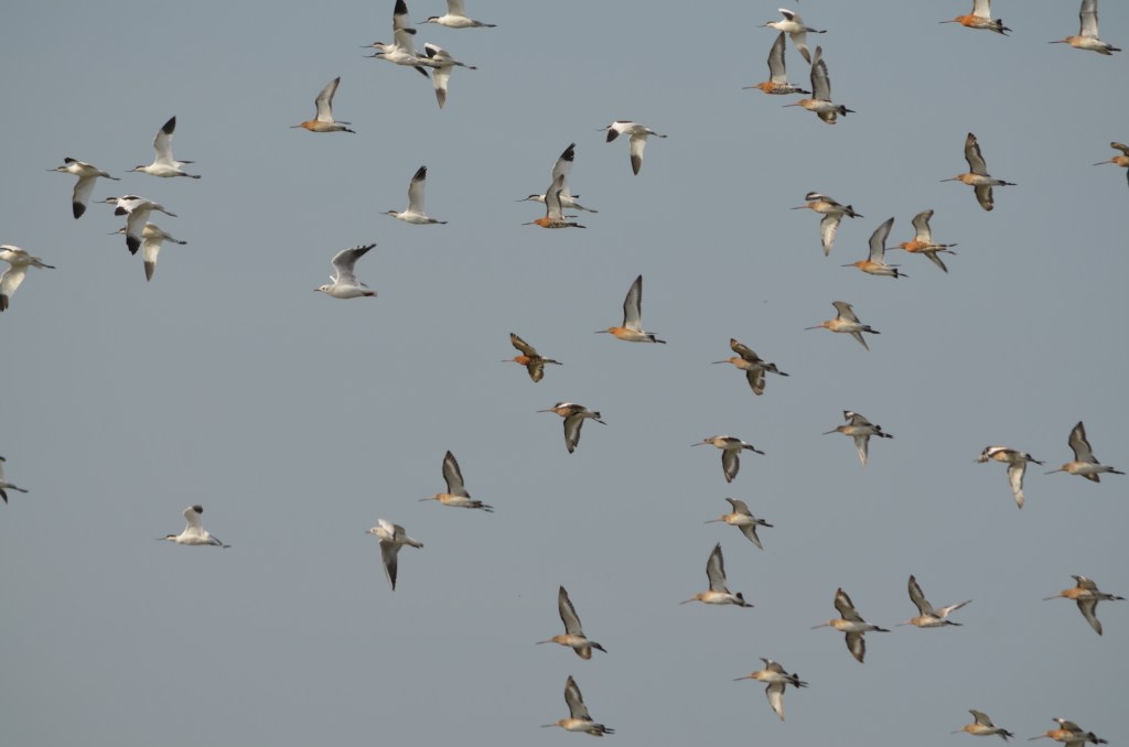 The Little egret that’s moving in the opposite direction to the gull (whatever type of gull it may be) later joined up with another four Little egrets, and together they stood motionless on the banks of the channel, until occasionally one would swiftly extend its neck downwards and spear its prey in its long beak. I mention this only because I wondered, for no particular reason, what collective noun describes a group of egrets. ‘Congregation’ seems to be the preferred noun, although there are others. I suppose the term might be apt, but only for a well-behaved congregation that is not moving much. Maintaining a spiritual tone, a collection of godwits is known as a ‘prayer of godwits’, although it’s a little more difficult trying to trace where the term ‘godwit’ actually originates.
